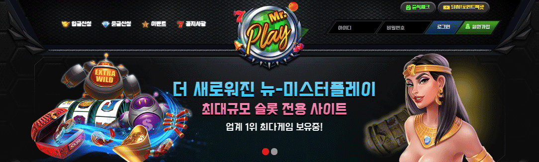 국내최대 규모에 슬롯전용사이트를 보유하고 있는 미스터플레이 슬롯게임은 막대한 자금력과 신속한 업데이트를 통해 빠른 입출금서비스 고객상담24시간 운영등을 제공합니다.